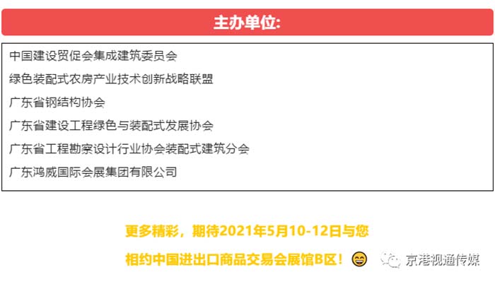 為了推進(jìn)裝配式建筑領(lǐng)域的廣泛合作,助力粵港澳大灣區(qū)建設(shè),由中國建設(shè)貿(mào)促會集成建筑委員會、綠色裝配式農(nóng)房產(chǎn)業(yè)技術(shù)創(chuàng)新戰(zhàn)略聯(lián)盟、廣東省鋼結(jié)構(gòu)協(xié)會、廣東省建設(shè)工程綠色與裝配式發(fā)展協(xié)會、廣東省工程勘察設(shè)計行業(yè)協(xié)會裝配式建筑分會、廣東鴻威國際會展集團有限公司等聯(lián)合主辦的,將于5月10-12日在中國進(jìn)出口商品交易會展館B區(qū)11.1-10.1號館隆重舉辦,本屆吸引了近300家優(yōu)質(zhì)工程總承包供應(yīng)鏈企業(yè)展示先進(jìn)技術(shù)和產(chǎn)品,覆蓋裝配式建筑開發(fā)建設(shè)、設(shè)計施工、集成房屋、部品部件、裝配式裝修、裝備制造等產(chǎn)業(yè)鏈上下游全領(lǐng)域。
